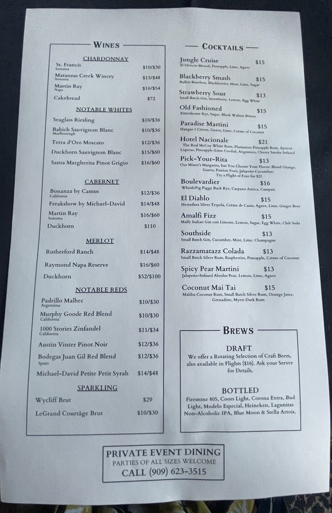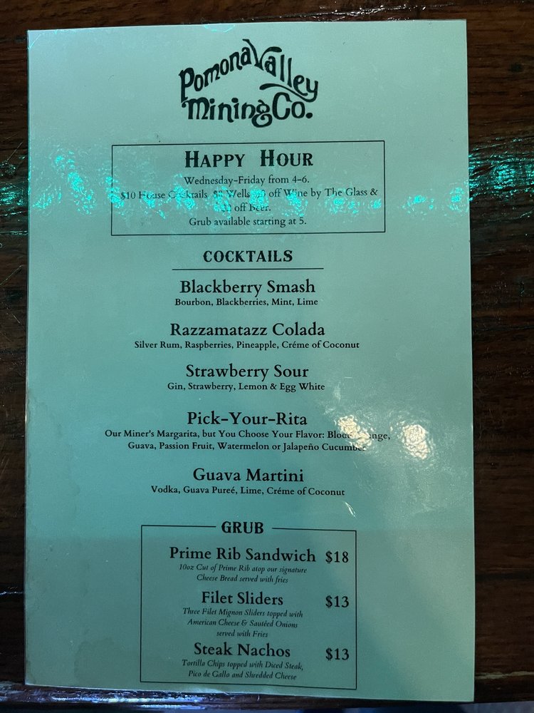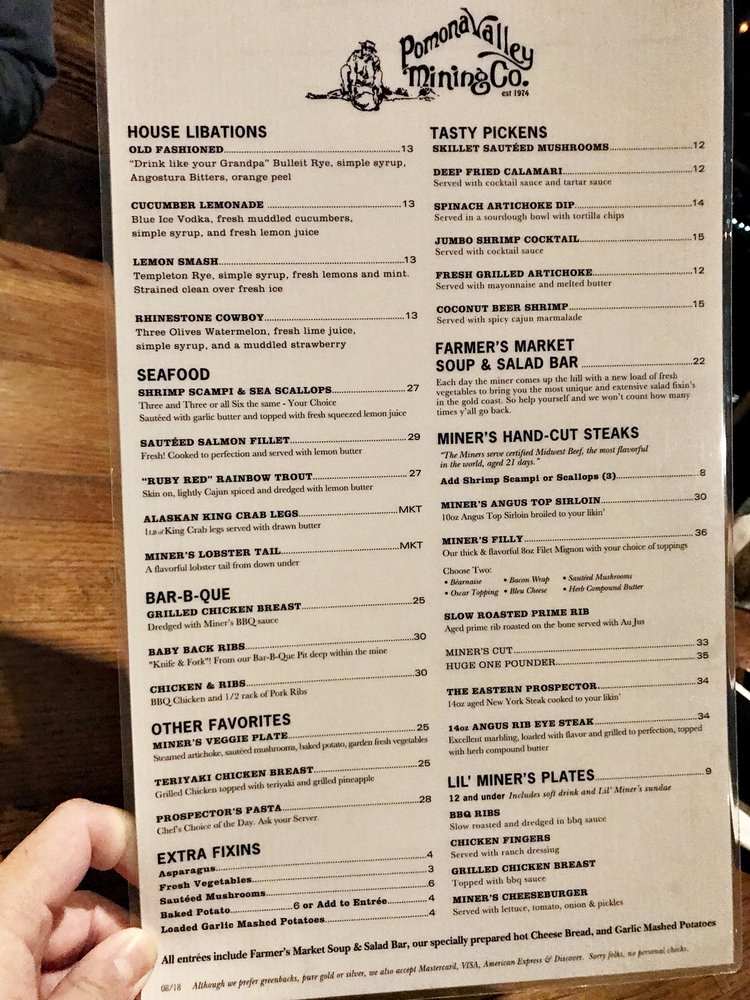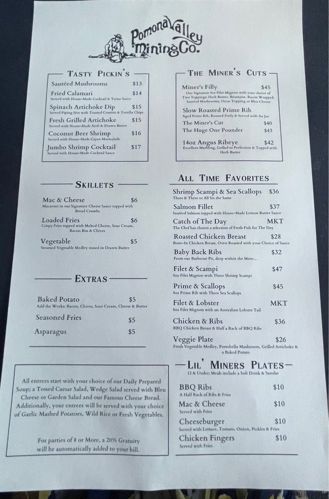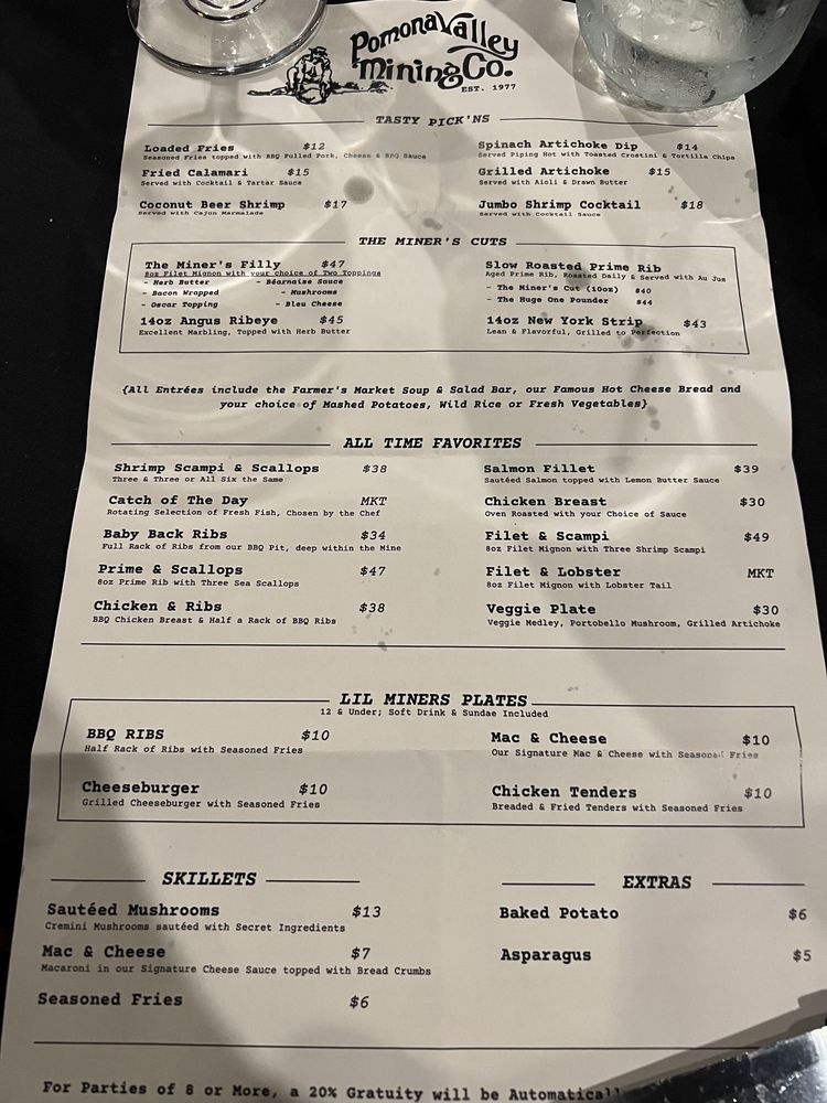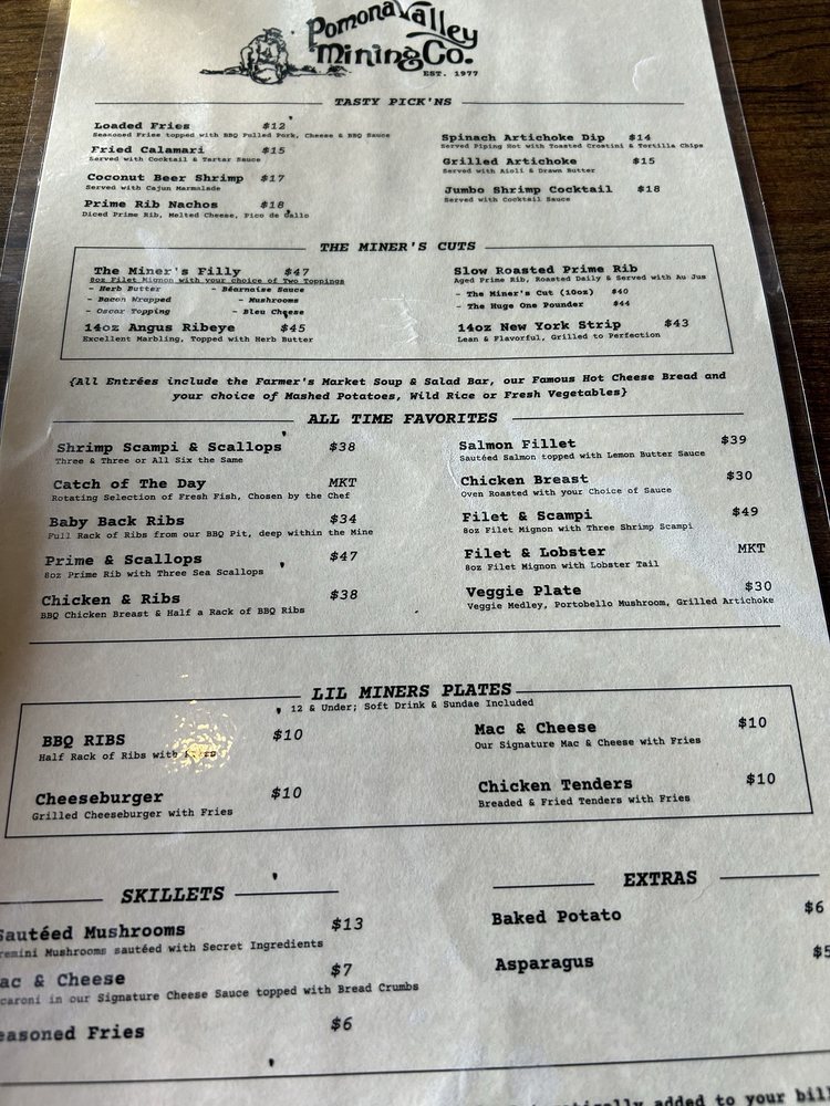 Pomona Mining in Pomona, CA is a versatile restaurant offering a range of dining experiences, from steakhouses to New American and seafood dishes. This restaurant truly caters to all, with vegan options, wheelchair access, and even cryptocurrency payments accepted. The menu features prime rib nachos, rack of pork ribs, and a must-try Miners margarita. With a cozy atmosphere and attentive bartenders, Pomona Mining is perfect for happy hour or special events like Murder Mystery Night. The breathtaking views of the city below add to the charm of this rustic establishment, making it ideal for a sunset dinner or brunch. While the food selection for dinner may be limited, don't miss out on the tasty salad and soup bar. Overall, Pomona Mining offers a unique dining experience with delicious food and excellent service in a stunning setting.